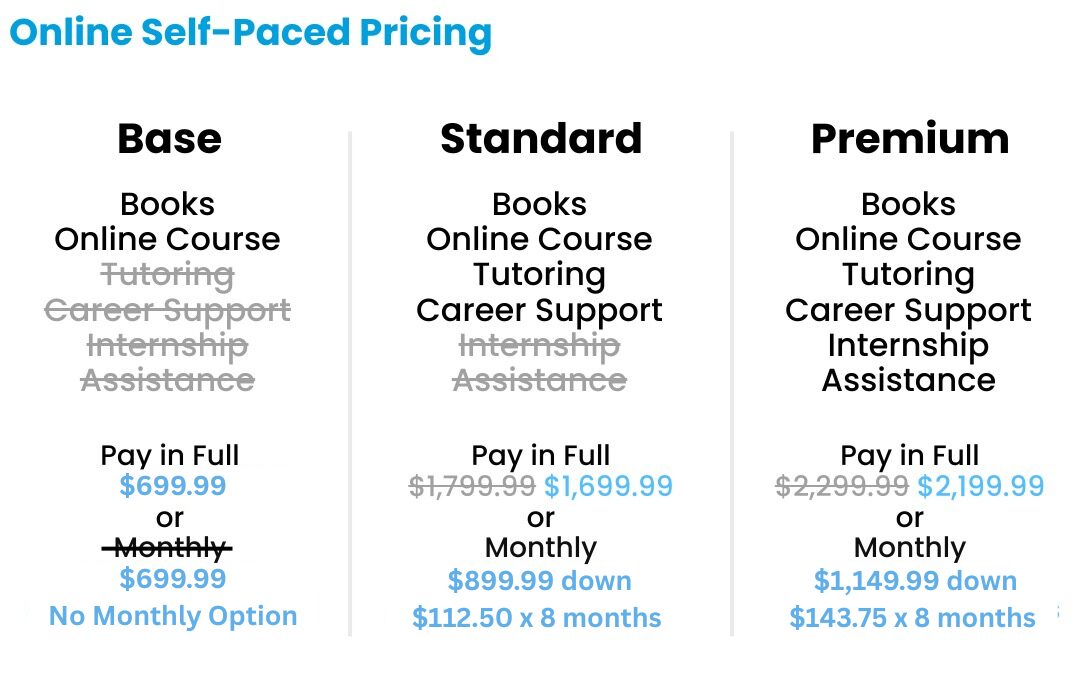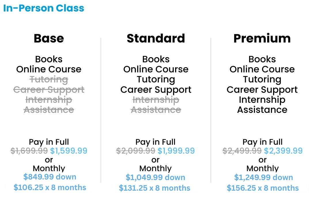 Financing options are available to meet our student’s needs. Pay in full or make payments over time. Our courses/classes can be very flexible.